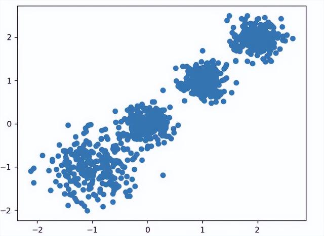 import matplotlib.pyplot as pltfrom sklearn.datasets.samples_generator import make_blobsfrom sklearn.cluster import KMeansfrom sklearn.metrics import calinski_harabaz_score# 创建数据集# X为样本特征,Y为样本簇类别, 共1000个样本,每个样本2个特征,共4个簇,# 簇中⼼在[-1,-1], [0,0],[1,1], [2,2], 簇⽅差分别为[0.4, 0.2, 0.2, 0.2]X, y = make_blobs(n_samples=1000, n_features=2, centers=[[-1, -1], [0, 0], [1, 1], [2, 2]],cluster_std=[0.4, 0.2, 0.2, 0.2],random_state=9)# 数据集可视化plt.scatter(X[:, 0], X[:, 1], marker='o')plt.show()
