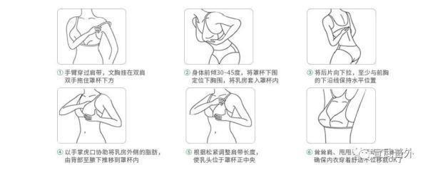 2,然后俯身前倾30度,两手拉住文胸底边向下拉,然后向上推隆使胸部完全包进罩杯内。
