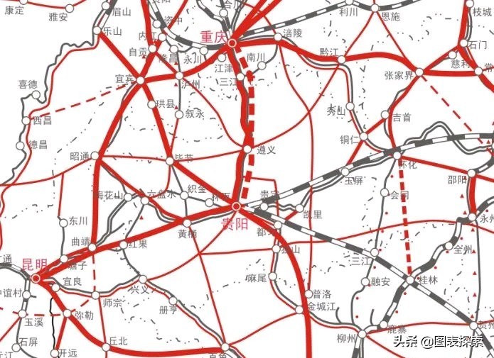 根据最新的“十三五”(2016-2020年)铁路规划和“中长期铁路网规划”(2016-2030年),贵州省的在建和规划铁路如下图所示。贵州铁路“十三五”规划基本能在2020年内如期实现,随着安六客专即将开通和盘兴客专开建,贵州市市通高铁目标预计将在2022年底实现。