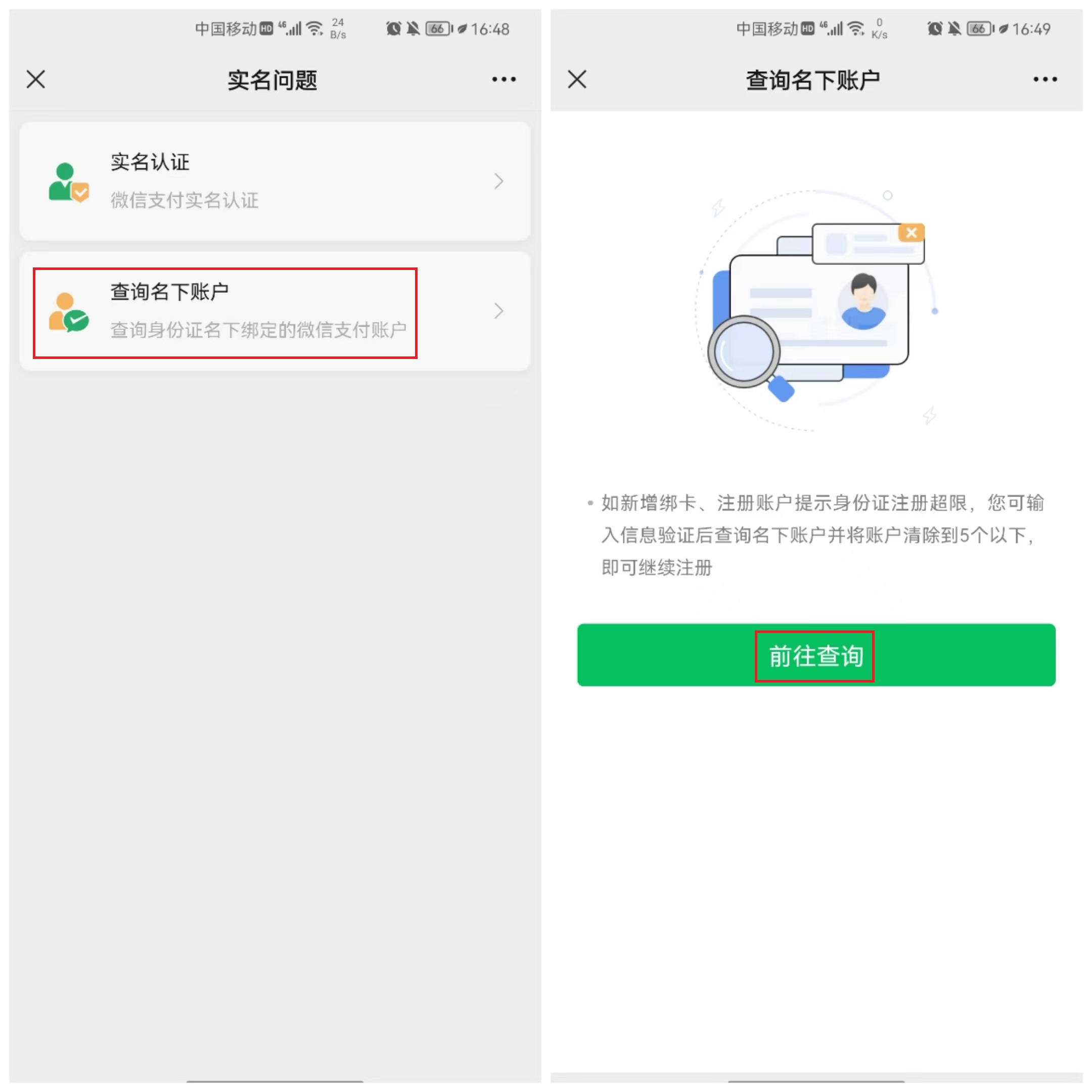 4.随后点击【查询名下账户】,一个身份证最多可以绑定5个微信账户;