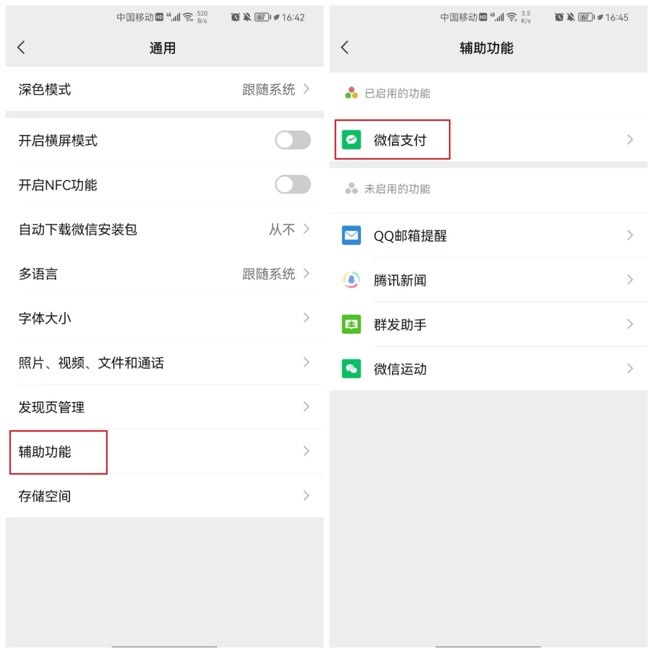 2.然后找到【辅助功能】,点击进入后,启用【微信支付】这个功能;