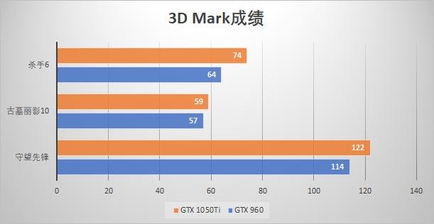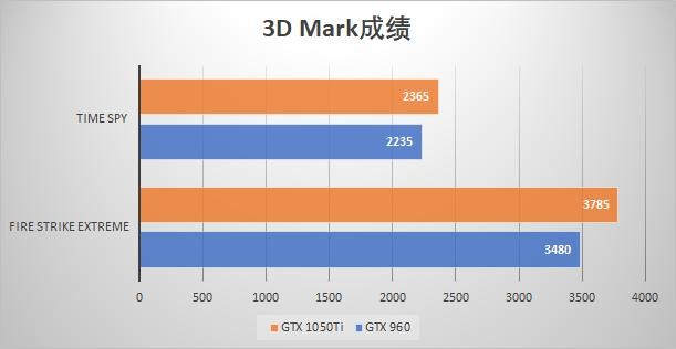 具体性能部分,在采用i7-6700K处理器,16GB DDR4-2666内存的情况下,在3DMark测试中,Fire Strike Extreme项目下,GTX 960得分3480分,GTX 1050Ti得分3785分,Time Spy项目中,GTX 960得分2230分,GTX 1050Ti得分2365分,可以看到在理论测试中,GTX 1050Ti具有一定优势,不过优势不大,平均领先也就7%左右。