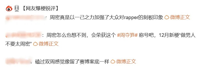 多位周密的同行rapper也纷纷写歌斥责他,《说唱新世代》选手“陈近南金闪闪”也发歌diss周密,力挺周芯竹“分手丢了热度,想靠芯竹发笔横财呢”。音频播放量火速破2600万,热度惊人。