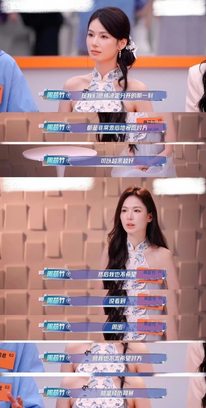 近日,周芯竹的新综艺片段播出,被问到感情话题,她表示“不希望看到周密被网暴。”