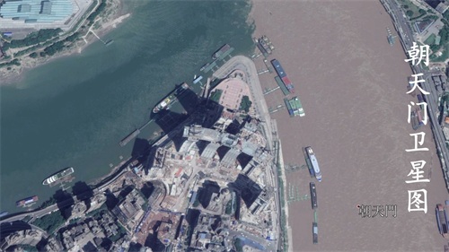 位于半岛最东侧的是在建中的重庆来福士广场。来福士广场由新加坡凯德集团投资,投资总额超过240亿元,总建筑面积超过112万平方米,是新加坡目前在华最大的投资项目。其中6座塔楼分别以350米及250米的高度化形为江面上强劲的风帆。立帆于朝天门之上,寓意“朝天扬帆”,建成后将成为重庆的标志性建筑。从这张卫星图像我们还能看到偏浑浊的长江水与偏清澈的嘉陵江水互不相容的神奇景观。