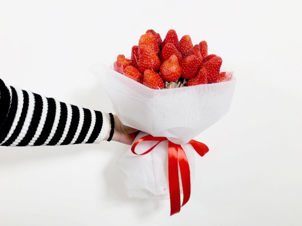 d、草莓花束在螺旋式,虎口需要紧紧握住手抓点,中间草莓滑落时,直接拔出重新组合;