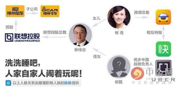 备注:柳传志的女儿柳青是滴滴快的总裁,侄女柳甄是Uber中国区战略负责人,最后,柳传志自己的联想,则是神州租车的大股东,柳家一门几乎包揽了专车市场前几大份额。