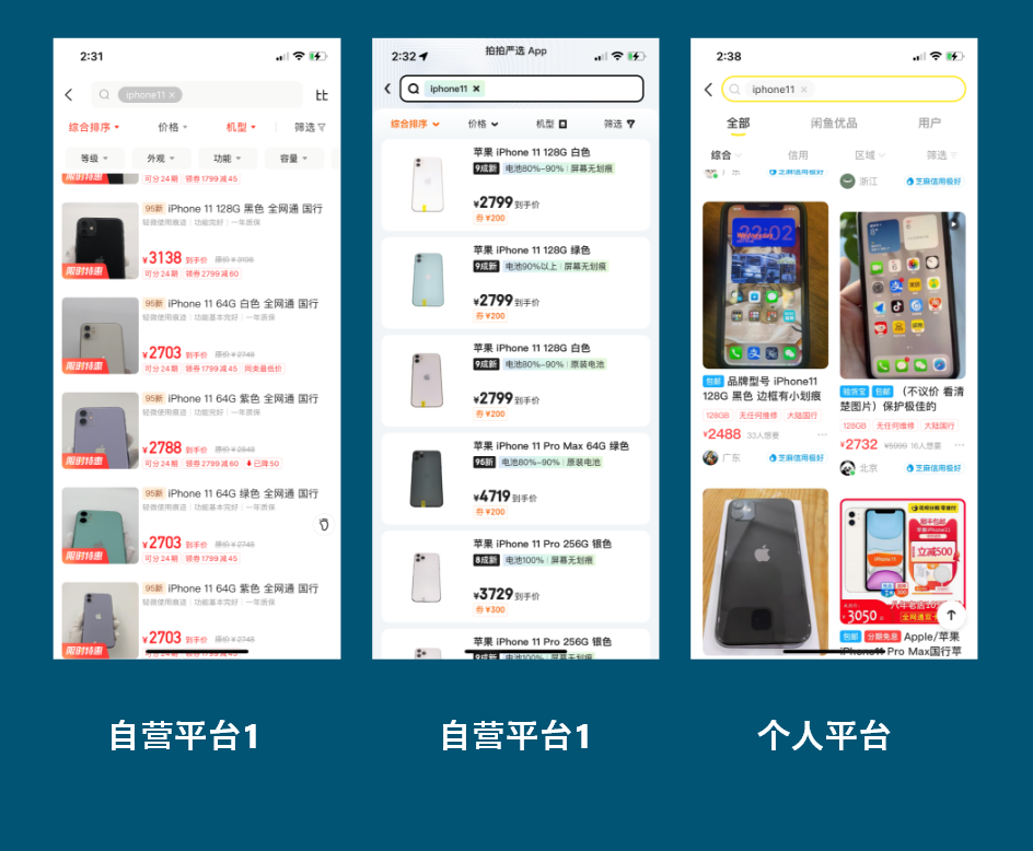 如下图所示,这是我做的一组对比,自营平台的价格非常固定,而在个人卖家平台,价格浮动则非常大,有一些略微有些小瑕疵的手机可能就会以一个非常低廉的价格出售,这对于一些对价格比较敏感的消费群体来说当然是更加有诱惑力的。