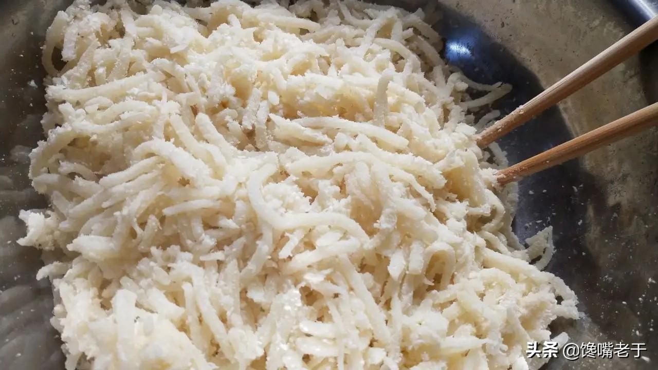 洋芋叉叉也叫作洋芋擦擦,洋芋指的是土豆,而叉叉取谐音擦擦的意思,因为洋芋叉叉是把土豆用擦丝器擦出来的!洋芋叉叉的做法比较简单,洋芋擦成粗条后,先用清水泡一下,再沥干水分,最后裹上面粉,在大蒸笼里一层一层地码好,蒸熟后再炒一下,老于感觉,这就是土豆最佳的吃法!