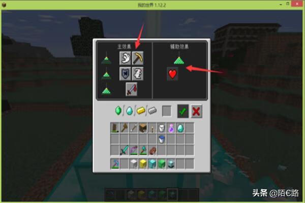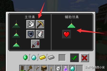 5、激活这些buff的方式是(最好用方法三的基座,这样buff才能更好加成出来),用一个铁锭、金锭或者钻石、或者绿宝石中的一个,放到格子中,点击左边的主效果中的一个,然后点击下面的绿色勾√就可以了。