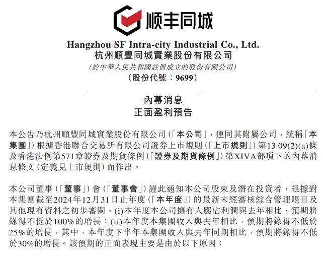 数字不会说谎,根据艾瑞咨询报告,2023年即时配送行业规模约为3410亿元,相较2018年的1168亿元增长显著,五年间复合增速高达23.9%。市场不断向好的同时,顺丰同城继2023年率先行业扭亏为盈成为“即时物流盈利第一股”后,2024年继续发布正面盈利预告显示全年净利润同比增长不低于100%,全年收入同比增长不低于25%,大幅领跑其他玩家。