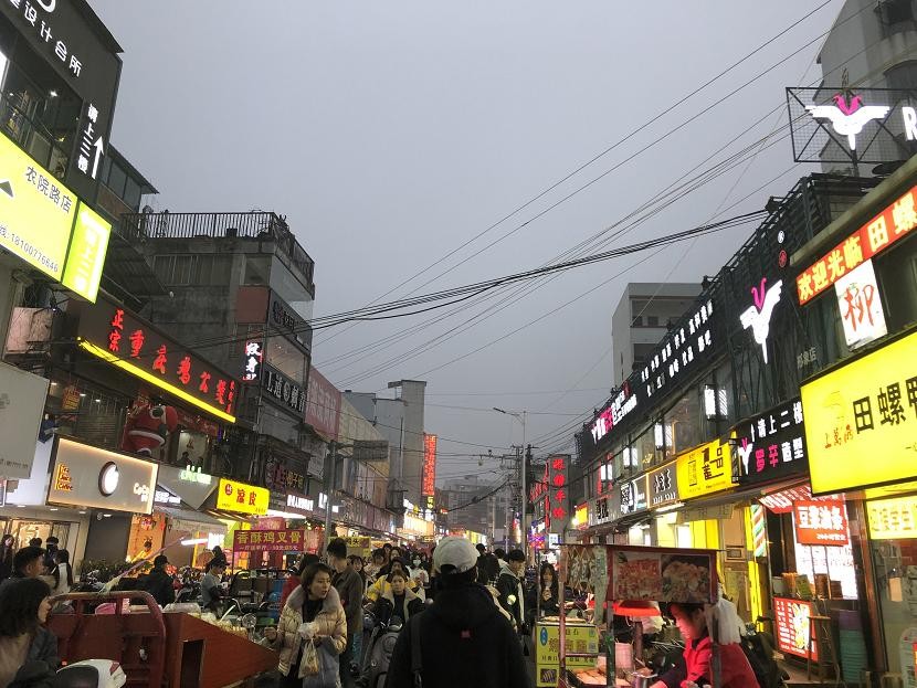 农院路白天行车,夜色渐出,各种小吃摊贩就陆续出摊了,不然可能就会没位置了呢。地处多所大学的交界地,除了是各校美女的买服饰圣地,还具有吃喝逛一站式解决,臭名远扬的臭豆腐、高山土豆、榴莲一品、排长队的烤猪脑花、韩国欧巴年糕等等,一边吃一边买,简直不要太赞了!