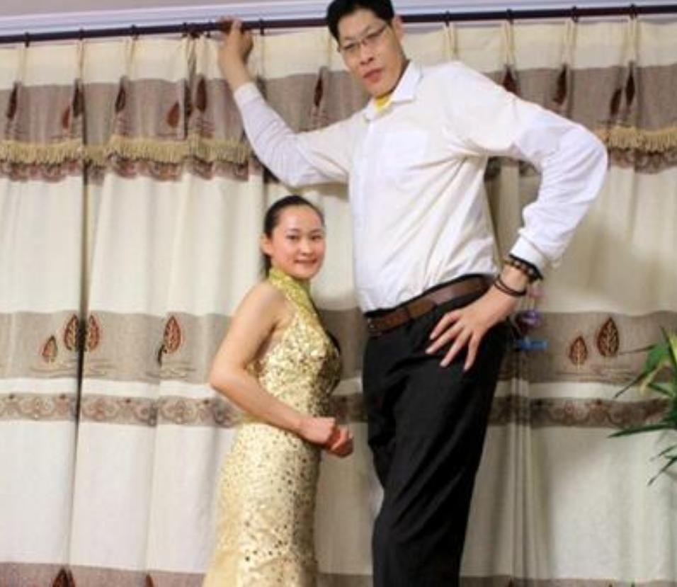 但是身高足以打破吉尼斯世界纪录的他,妻子却只有一米六五。