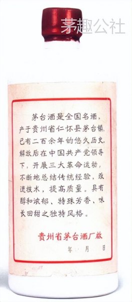 背标全文:“茅台酒是中国名酒,产于贵州省仁怀县茅台镇,历史悠久,工艺独特,早已驰名中外,为国内消费者所热爱,一九一五年巴拿马万国博览会荣获奖章、奖状。新中国成立后,茅台酒保持井发扬了优良的传统工艺,技术精益求精,质量稳定提高。具有酱香突出、幽雅细腻、酒体醇厚、回味悠长等特点,历届全国评酒会均被评为国家名酒,荣获国家金质奖章。年 月 日”