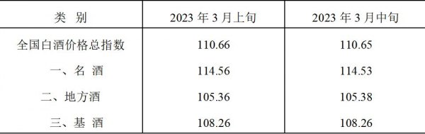 表2 2023年3月上旬——2023年3月中旬全国白酒定基价格指数表