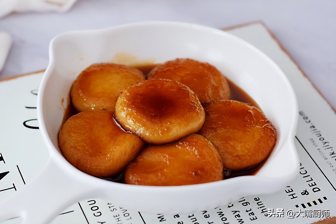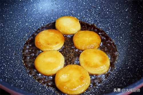 ③锅里倒入适量清水,加入一勺红糖,小火把红糖煮化,放入煎好的小饼,大火收汁,煮至糖汁粘稠后即可盛出。