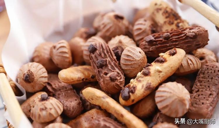 ②把搅拌好的巧克力牛奶鸡蛋糊倒进裱花袋里,烤盘上铺上油纸,用裱花袋挤成圆形或条形,表面放上巧克力豆。烤箱或空气炸锅,180℃烤20分钟,巧克力麻薯就做好了。没有巧克力粉可以不放,也可以换成自己喜欢的口味,比如抹茶粉。