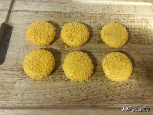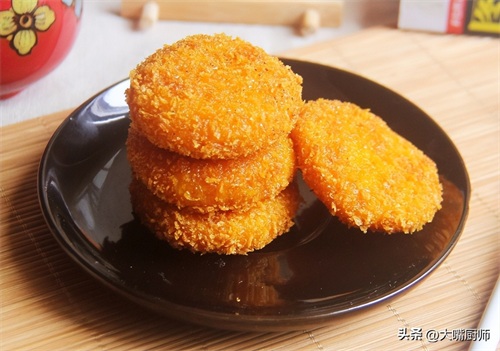 ③把南瓜面团搓成长条,分成小面剂子,搓成圆球再压扁,放进面包糠里,裹上一层面包糠。锅里倒油烧热,六成热时放入南瓜饼,小火炸至颜色金黄后即可出锅。