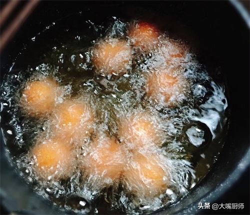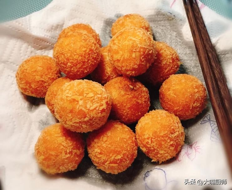 ③把红薯丸子放进面包糠里滚一圈,锅里加油烧热,放入红薯丸子,中小火炸至表面颜色金黄即可捞出,放在盘子里控油即可。