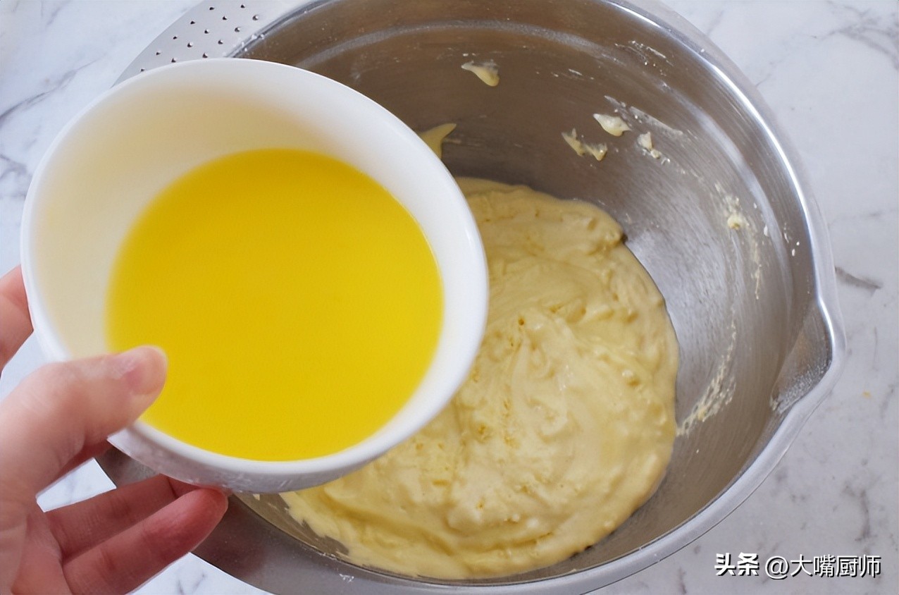 ②120克糯米粉加入3克泡打粉,用筷子搅拌均匀,筛入打发的蛋奶糊中,用刮刀翻拌至无干粉。加入牛奶黄油,用刮刀继续翻拌均匀,最后的混合面糊装入裱花袋里。