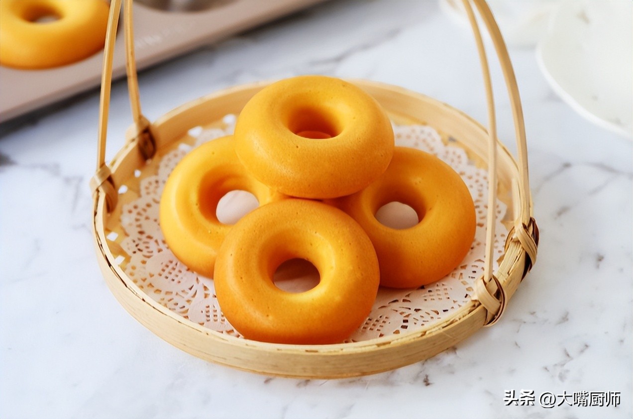 ③准备一个甜甜圈模具,把混合面糊挤入模具中。烤箱180℃预热10分钟,放在中层烤20分钟,出炉后趁热脱模冷却,甜甜圈就做好了。