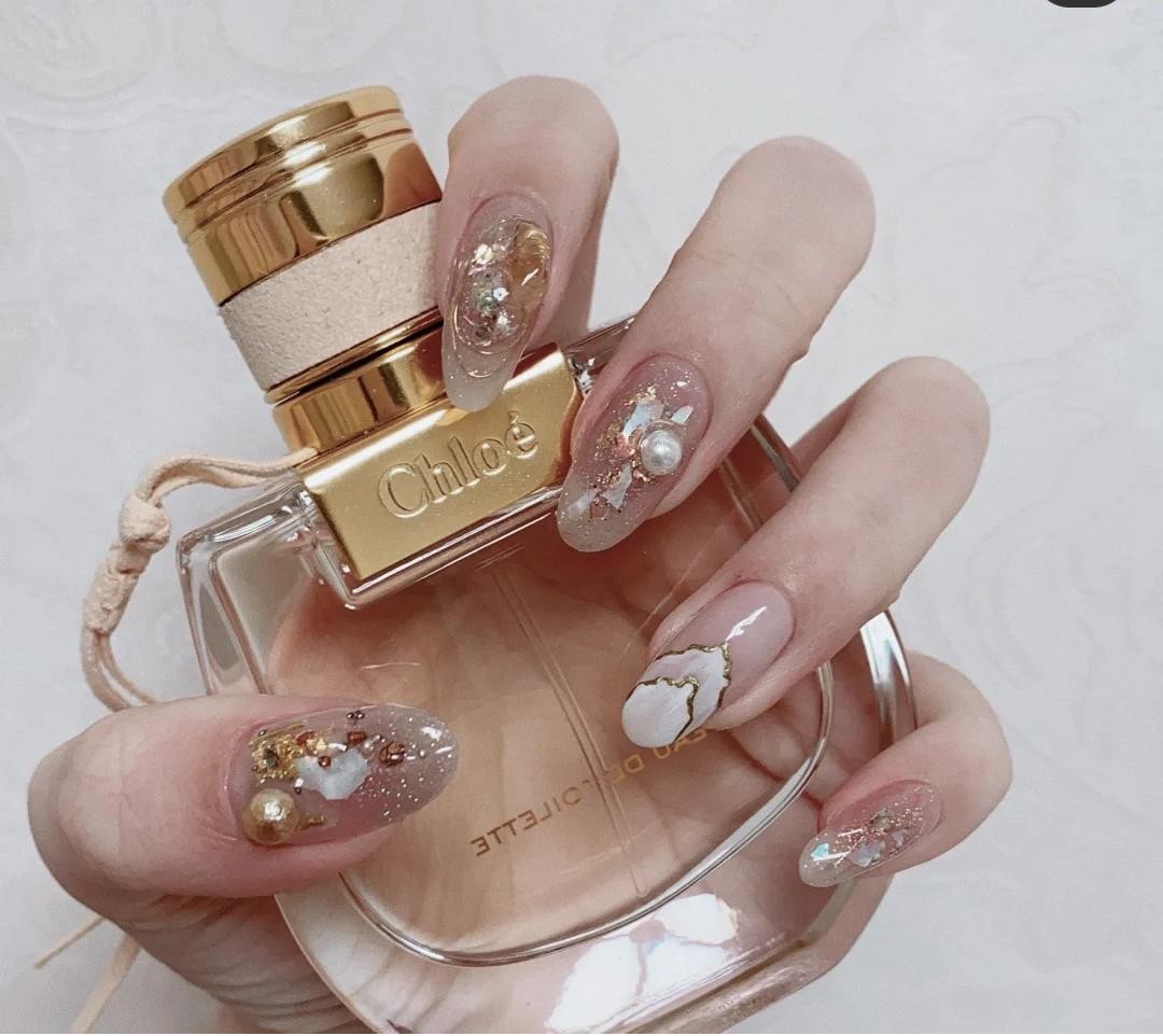 粉色真的是一个超级温柔的颜色,尤其是肉桂粉比起来普通的颜色,这个颜色会更加的温柔。所以上面就算点缀一些金箔和珍珠,也并不会很夸张,反而透着一股熟女的魅力。而且这个颜色就算是上班族做得也很不错,不仅不夸张,反而很显得手白呢。