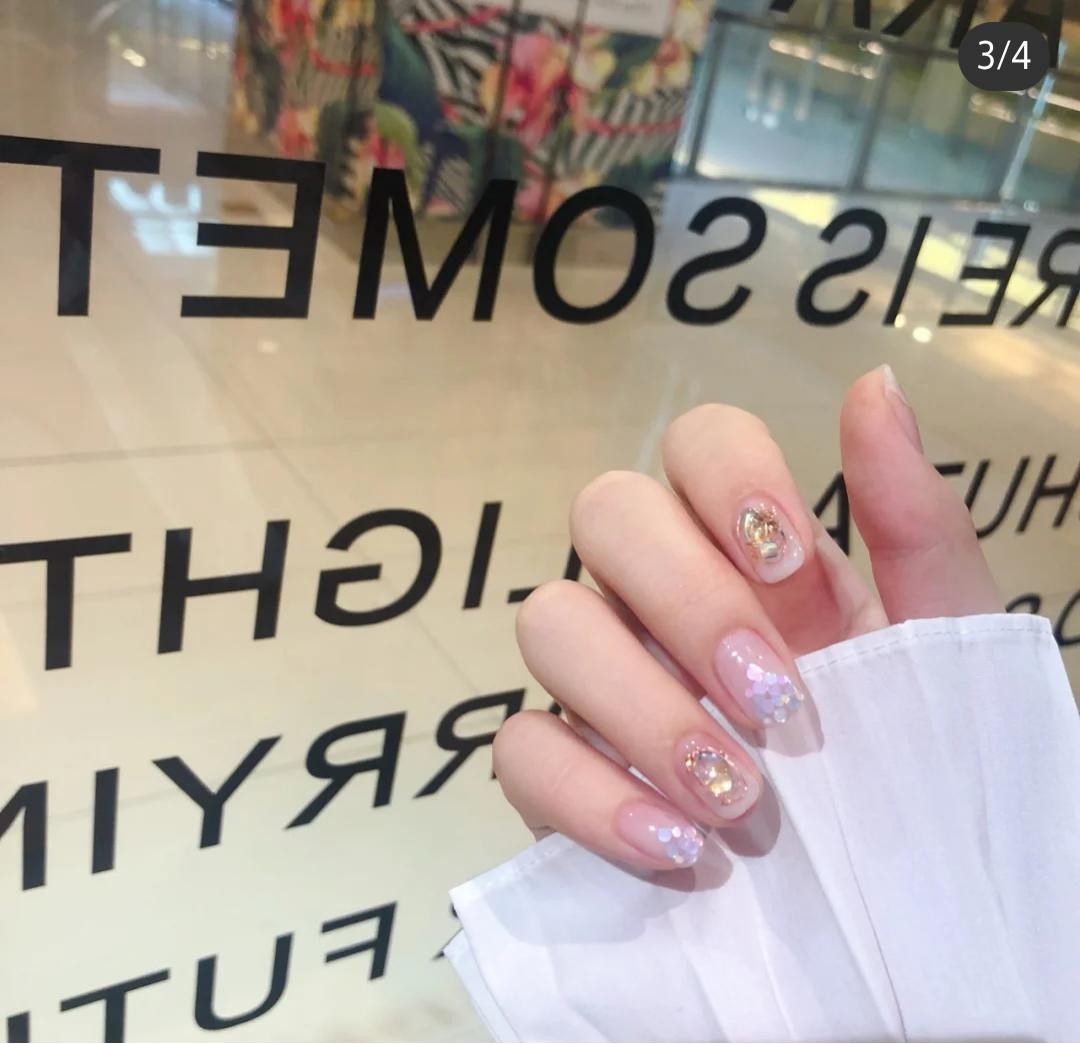 细看之下就会发现,这款美甲和前面几款比起来会更加的梦幻一点。这款整体是一个比较淡的透明色,上面加了很多大水钻作为装饰和点缀。整体看起来感觉会比较梦幻一点,同时也十分的轻盈,就算上学的女孩子涂了也不会很夸张,不过在阳光下会十分的好看罢了。