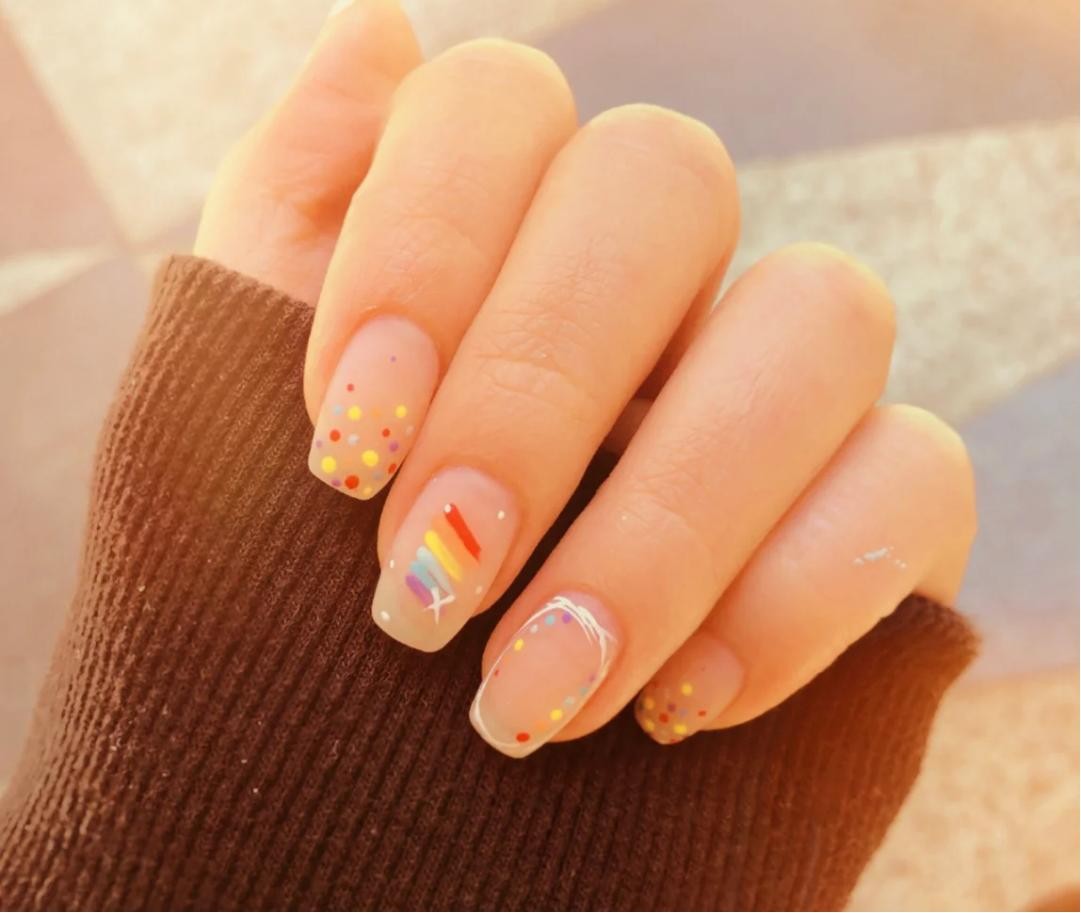 这个美甲的款式整体看起来特别的少女,而且童话风十足。上面有很多可爱的小装饰,每一个都无比的少女,同样也是一个很适合学生党的造型,不仅特别的显手白,而且也不会很夸张,整体的感觉特别的好看。我个人觉得最为抢眼的还是中指上的那个小彩虹设计,让人看一眼就想起来了明媚的春天,真的是一个很好看的美甲配色。
