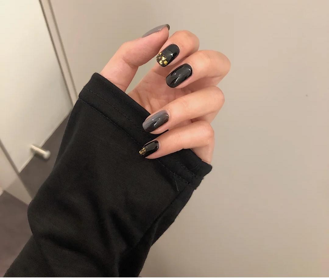 很多人觉得黑色的美甲不适合夏天,实际上只是你没有选对美甲的款式。图中这个黑色的亮面美甲就十分的好看,上面贴着很细微的金箔装饰,只在指尖处有一些零碎的,所以并不会太夸张,也不会太张扬。这种美甲不适合平常穿搭比较可爱的女孩子,适合那种酷女孩哦~