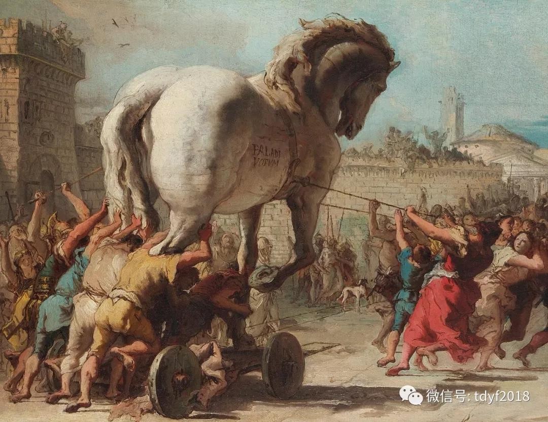 为后人所熟知的,是后来的剧情。联军假装溃退,扔下了一个巨大的木马留在海滩。特洛伊人把木马作为战利品运回到城内,甚至为了成功运进城内,特洛伊人还不惜拆掉了一部分城墙。围着这个巨大的木马,特洛伊举行了盛大的欢庆仪式。很显然,在特洛伊人看来,战争已经基本结束了。