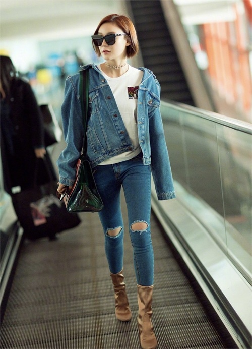 一身休闲丹宁服+驼色系的短靴,是不是最最适合秋日呢?驼色靴子除了复古,还容易显得温柔些。