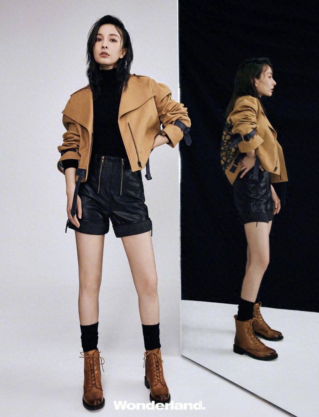 用靴子搭配裤子时,小编建议选择七分裤,或者将裤腿折起来,这样可以凸显腿长。