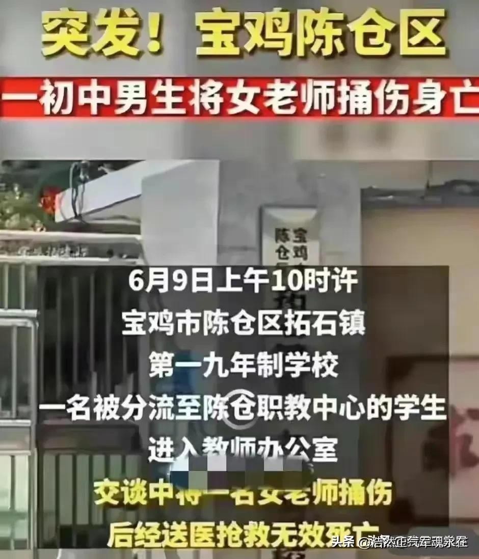 2023年6月9号,陕西省宝鸡市陈仓区,一个镇中学教师办公室内,一名15岁的男中学生,用水果刀直接将自己的班主任女老师捅伤了。受伤女老师被送到医院以后,抢救无效死亡了。