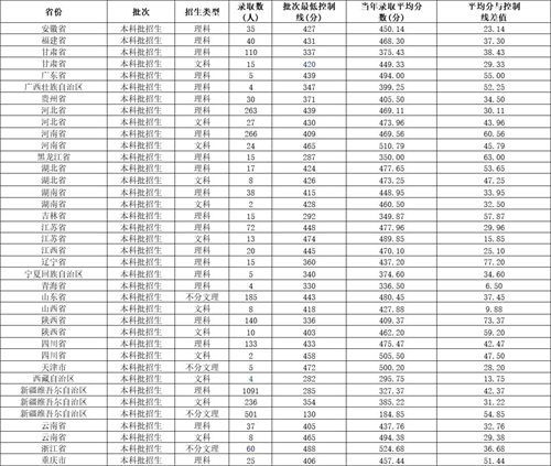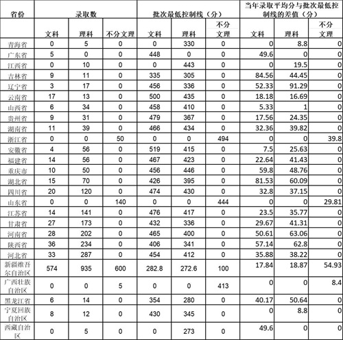 2023年,该校招生计划为3500人(含专升本501人),面向全国27个省(自治区、直辖市)招生,招生人数3488人(其中高中起点本科2987人,专科起点本科501人),完成招生计划99.66%,报到人数3349人(其中:新疆生源1716人,占51.24%,其他省份生源1633人,占48.76%。),报到率96.01%。录取最低分超过各省份二本线50分的有11个,在20分以上的有23个,生源质量显著提高。2023年生源情况一览表如下: