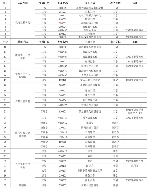 现有38个专业,涵盖理学、工学、经济学、管理学、文学、法学六个学科门类;2021年新增能源服务工程、机器人工程、食品卫生与营养学、商务英语4个专业;2022年新增储能科学与工程、材料化学、材料成型及控制工程和医学信息工程4个专业。