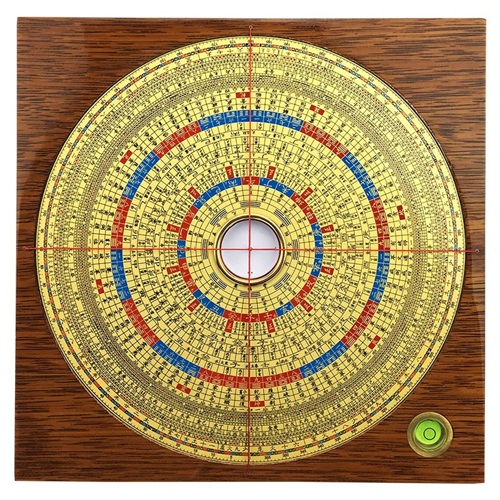 罗盘主要由天池、天心十道、内盘、外盘组成。天池由顶针、磁针、海底线、圆柱形外盒、玻璃盖组成,固定在内盘中央,指南针有箭头的那端所指的方位是南,另一端指向北方。天心十道是读取内盘上各层内容的指示线,必须相互垂直,四个穿线孔分别定位于外盘四个边的中心点上。内盘是紧邻指南针外面可以转动的圆盘,上面印有许多同心的圆圈,一个圈就叫一层。外盘是正方形的托盘,红线从它外侧穿入,成为天心十道,外盘必须是标准的正方形,四个边不弯曲、歪斜,放置内盘的园凹的圆心应在外盘的几何中心。