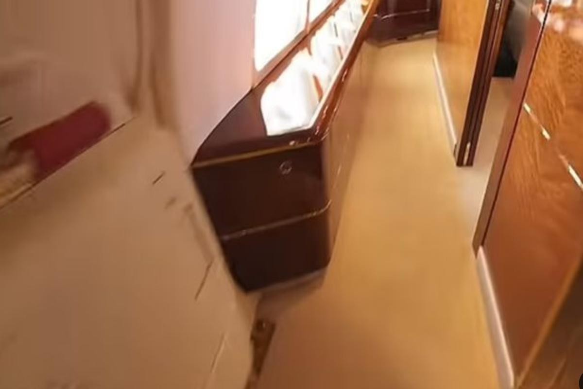 随着凯德镜头的移动,我们看见了飞机里面更多的场景,从放着平板电视的小客厅出去以后,旁边就是一个放着双人床的那房间。