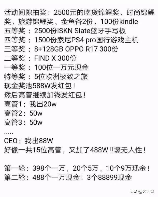 据员工介绍,在晚会中确实穿插举行了抽奖活动,特等奖是5位欧洲极致之旅。除此之外,“还有很多现金和奖品抽奖。现金奖原本为588万元,这是本来准备好的。抽完后,高管们纷纷又自己拿了奖金出来,总共488万元,其中CEO拿出了88万。”