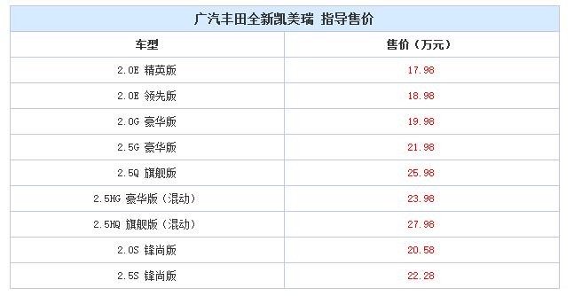 全新第八代凯美瑞搭载2.5L、2.5L HEV、2.0L三大动力总成,包括凯美瑞、凯美瑞运动及凯美瑞双擎三大系列九款车型,售价区间为17.98-27.98万元。