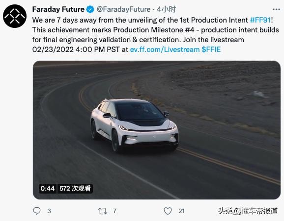 [懂车帝原创 行业] 日前,法拉第未来(FF)通过官方账号宣布,其首款车型FF91将于7天后正式问世。