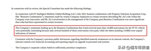 而在今年2月1日,FF发布独董特别审查结果。FF在业务合并前的声明中称,它已收到超过14000份FF 91车辆的预订,这可能具有误导性,因为其中只有数百份预订已支付,而其他(总计14000 份)是未支付的。