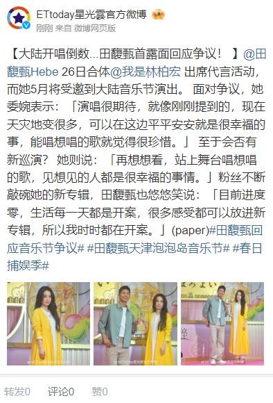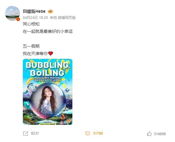 据悉,田馥甄将在5月2日出席天津举办的“泡泡岛音乐与艺术节”,活动一连三天,包括SHE队员陈嘉桦、窦靖童、朴树等人都会出席。