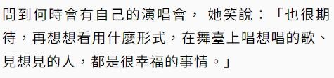 田馥甄显然不想正面回应被抵制一事,被问到什么时候开演唱会,她笑着说很期待,想看看什么形式,在舞台上唱歌,见到想见的人都是很幸福的事情。