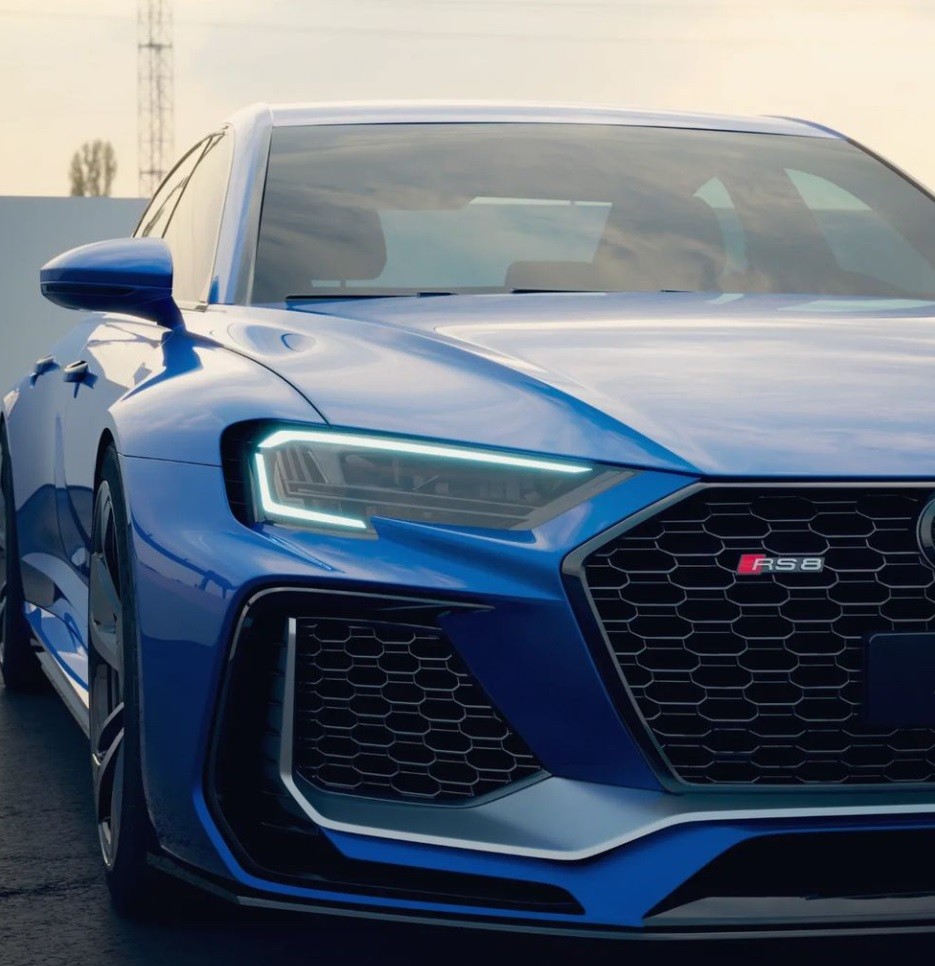 让我们来看看这款RS8怎么样,整体线条上,RS8变得棱角更加分明和强硬,发动机舱上4条隆起的线条延伸至车头,显得运动感十足。前脸的六边形中网设计的更大更夸张,样式也进行了重新设计,虽然蜂窝状格栅和RS6相似,但加粗了每个蜂窝的线条,中网两侧类似战机的进气口的大尺寸散热格栅不但看上去杀气十足,给人一种强烈的吞噬感,还能提供额外的空气动力学性能,为刹车系统提供高效的散热效果。此外还配备了新的下包围扰流板,全新设计的前脸让车头看上去透着凶狠和暴力。