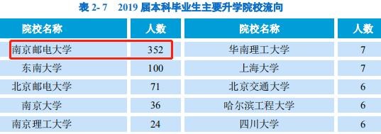 本科国内升学情况,本科毕业生升学1129 人。其中86.63%流向了"双一流"建设高校深造。留本校深造352人(其中保研约47人、考研305人);其余主要流向东南大学(保研约40人、考研约60人)、北邮、南大(保研3人,考研33人)、南理工等。2019届推免生:216人。保研率4.2%。考研率17.52%。
