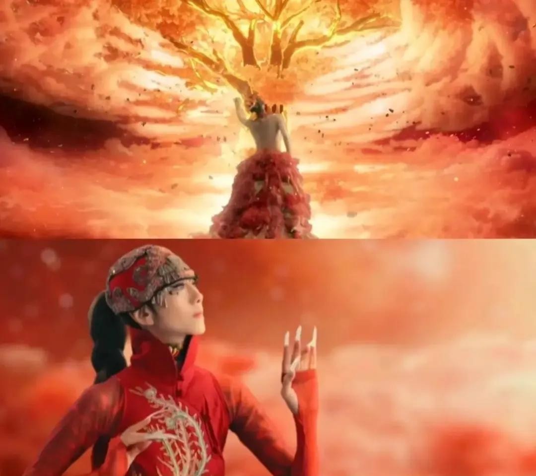 最令人震撼和惊艳的当属杨丽萍老师的《凤鸣朝阳》。《诗经·大雅·卷阿》云:“凤凰鸣矣,于彼高冈;梧桐生矣,于彼朝阳。”火红的舞台上一只只凤凰展翅,或腾飞云端,或临河戏水,光影中观众感受到了凤凰的尊贵和浴光重生。舞台上舞者的每一个舞步,都是对传统文化的深情致敬,以凤之对话承载着吉祥祝福。