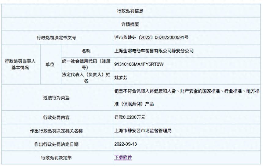 9月22日消息,据上海市市场监督管理局官网显示,上海全娜电动车销售有限公司静安分公司因为涉嫌销售不符合保障人体健康和人身、财产安全的行业标准的锂离子电池转用充电器而被给予行政处罚。