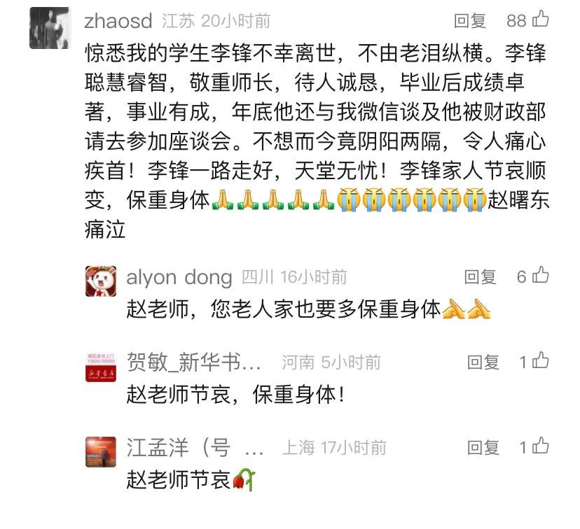 而在得知自己得意门生意外去世之后,李锋博士的恩师,79岁的南京大学经济学院国际经济贸易系系主任赵曙东教授更是泣不成声,在讣告下边留言让人看完之后泪目