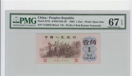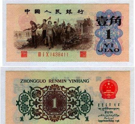背绿一角纸币,版别年号为1962年,实际发行时间为1966年10月1日,并于1967年12月开始停用。按所使用的纸张有无水印,1962版背绿一角分为空心五角星水印(俗称背绿水印一角)和无水印(俗称背绿一角)两大类。带水印的背绿一角发行量和存世量相对较少,自然收藏价值和市场价格也就更高一些。