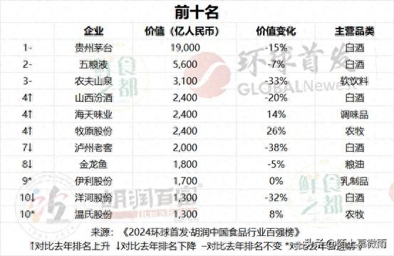 贵州茅台以1.9万亿的价值蝉联中国食品行业最具价值企业,尽管相比去年下降了15%。五粮液以5600亿元的价值位居第二,价值下跌7%。